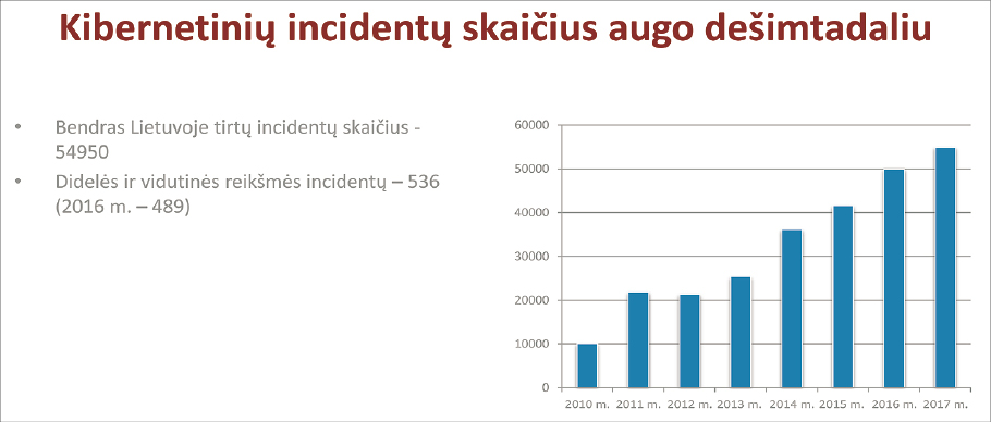 Nacionalinio kibernetinio saugumo centre dirba 56 žmonės, ištirta apie 55 tūkst. incidentų. Anot viceministro, kibernetinių incidentų skaičius nuo 2010 metų augo dešimtadaliu.
