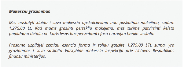Pranešimas apie laimėjimą žaidime, kuriame net nedalyvavote, nežinomo asmens palikimą ar atlygį už tam tikrus veiksmus. Tokie laiškai Lietuvos gavėjus dažniausiai pasiekia anglų kalba. Juose nurodomos itin didelės – šimtus tūkstančių ar net milijonus siekiančios sumos, į kurias neva pretenduoja pranešimo gavėjas. Kad gautų nurodomą sumą, adresatas viliojamas atsiųsti arba įvesti tam tikrus savo duomenis.