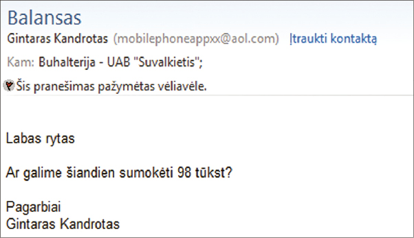 Įdomu, kad visai neseniai toks laiškas buvo įkritęs ir į išradingesnių sukčių dėmesio lig šiol išvengdavusios „Suvalkiečio“ vyr. buhalterės elektroninio pašto dėžutę. Iš pirmo žvilgsnio buvo galima pagalvoti, kad laiškas, pavadintas balansu, iš tiesų atkeliavo iš mūsų laikraščio redaktoriaus elektroninio pašto, nes ekrane buvo matyti būtent toks pašto siuntėjo vardas. „Labas rytas, – rašė redaktoriumi apsimetęs asmuo. – Ar galime šiandien sumokėti 98 tūkst.?“