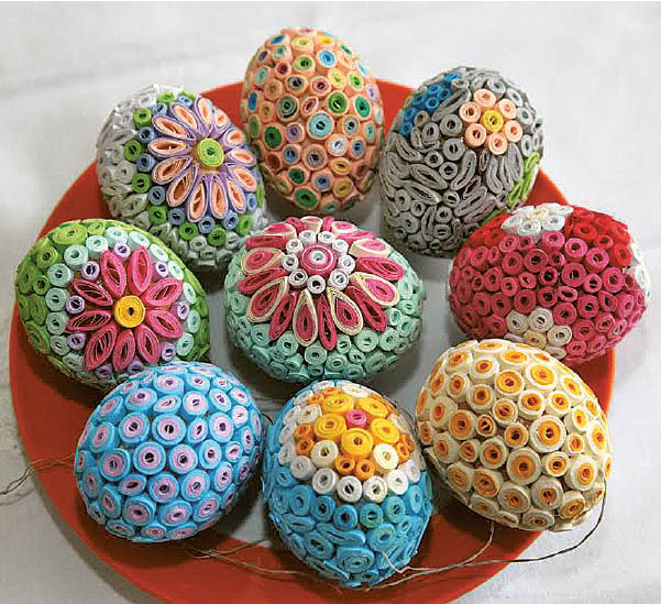 – Išbandžiau daug rankdarbių rūšių, bet kvilingo meninės galimybės mane tiesiog sužavėjo, – apie susikaupimo, ramybės, kruopštumo reikalaujantį pomėgį sako Augonita. Pirmiausia pabandžiau padaryti kalėdinius žaisliukus, paskui pradėjau marginti kiaušinius. Pradžioje pusės centimetro pločio juosteles karpiau žirklėmis, vyniojau pačios pasidarytu įrankiu, ant šukų dantų sukau ažūrą. Paskui įsigijau dokumentų pjaustymo mašiną, kuri visus lapus lygiomis juostelėmis susmulkina. Svarbu tik tinkamą popierių nusipirkti – kad ne tik iš abiejų pusių būtų spalvotas, bet ir sukarpius spalva matytųsi. Vėliau ir susukimui įrankį nusipirkau, kitą, dar patogesnį, toks žmogus padarė. Taip ir dariau visokių formų lapelius ir lipdžiau vieną prie kito, – pasakoja A. Baliūnienė. Rudenį, kai obuolius nuskina ir visus kitus lauko darbus pabaigia, karvutę į tvartą parsiveda, Augonita palinksta prie rankdarbių. Įsijautusi per žiemą, ji prigamino šimtus margučių dovanoms, o šiemet prie namų augantį šeivamedį Velykoms papuošė penkiais šimtais kiaušinių – dviem eilėmis, kad būtų stipresni, nudažytų.