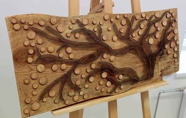 – Lengviausia vinį įkalti į natūralaus medžio lentą, bet gali būti ir taip, kad prasėdėjus prie darbo 20–30 valandų lenta gali sutrūkti ir visas kūrinys nueis niekais. Kad taip neįvyktų, vyras Povilas sumąstė, kaip apsaugoti šimtametę lentą nuo sutrūkimo – iš apačios priklijuoti plokštę, – sakė Jovita, už kantrybę ir palaikymą dėkodama ir vyrui, ir trims jųdviejų sūnums.