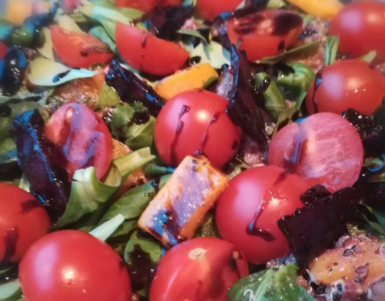 Ant kruopų, keptų burokėlių ir moliūgų užpilame šį užpilą. Salotas papuošiame gražgarstės lapeliais ir vyšniniais pomidoriukais.