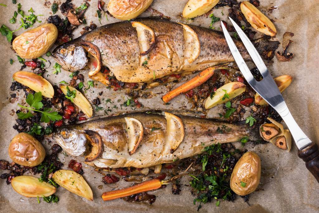 - Įdėkite upėtakį į iki 180 laipsnių įkaitintą orkaitę ir kepkite apie 30-40 minučių, kol upėtakis bus auksinio atspalvio.