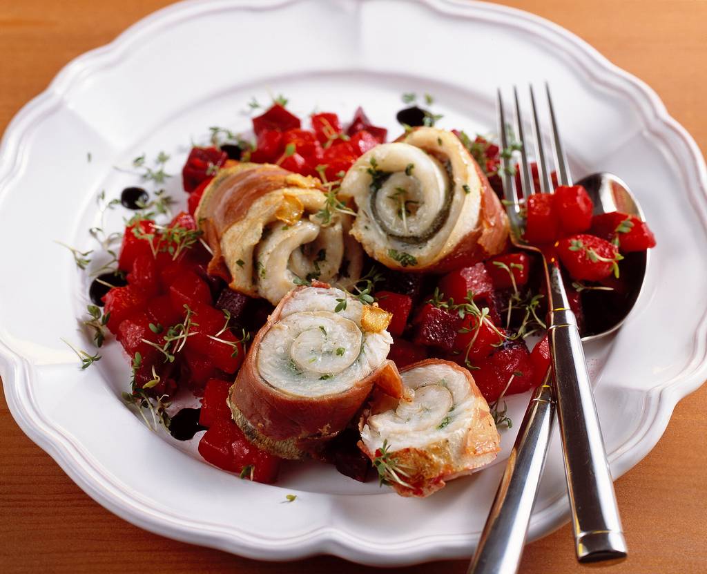 Lydekų filė vyniotinis su prosciuto