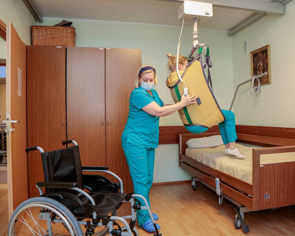 – Kiekviename kambaryje yra lubinis keltuvas, kuriuo visiškai nenaudojant darbuotojo fizinės jėgos žmogų galima saugiai pakelti iš lovos ir pasodinti į ratukus, taip pat – iš ratukų iškelti ir paguldyti į lovą. Yra daugybė kitų pagalbinių techninių priemonių (pavyzdžiui, mobilios vonios), kurios padeda darbuotojams saugiai ir „nelaužant stuburo“ atlikti pačius įvairiausius darbus prižiūrint gyventojus – juos maudyti, maitinti, pasodinti ar paguldyti. Pagrindinė slaugytojo pareiga – kontroliuoti, kad viskas būtų atlikta saugiai, – sako V. Bačkierienė.