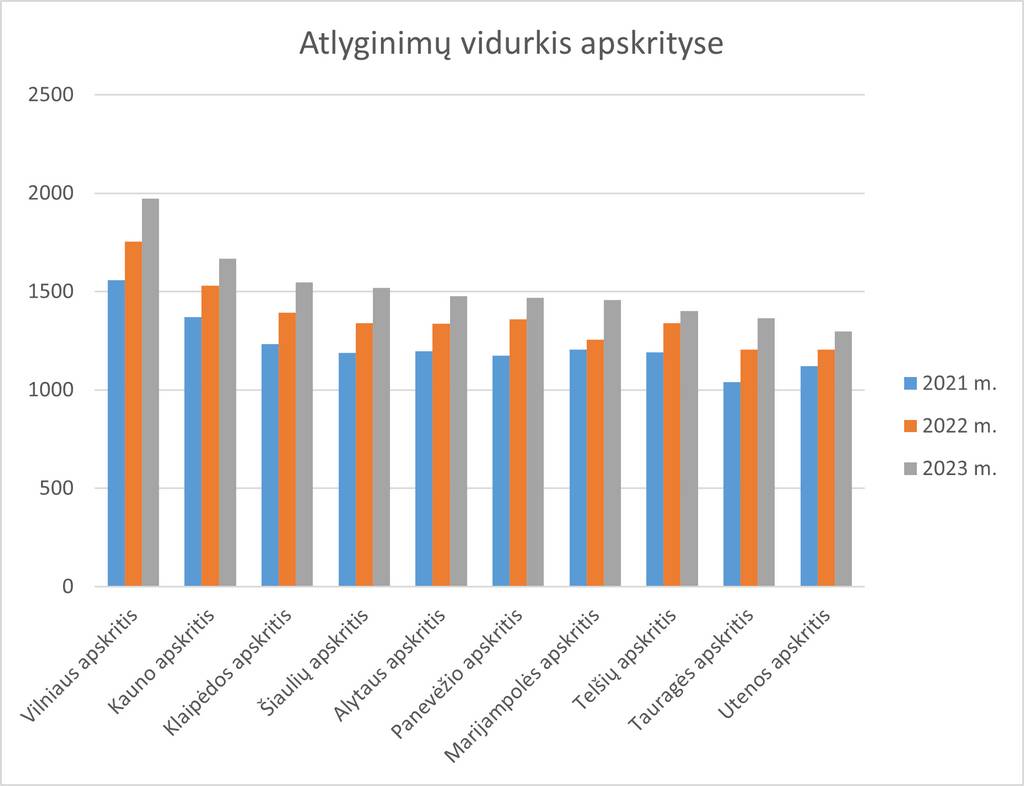 Per metus atlyginimai labiausiai augo Marijampolės, Tauragės ir Šiaulių apskrityse. Aukščiausi atlyginimai išlieka Vilniuje, Kaune ir Klaipėdoje. Vilniaus ir Kauno regionuose atlyginimų vidurkio skirtumas – 18 proc. Klaipėdos regione atlyginimų vidurkis 28 proc. mažesnis nei Vilniaus. Didžiausias atotrūkis tarp Vilniaus ir Utenos – 52 %.