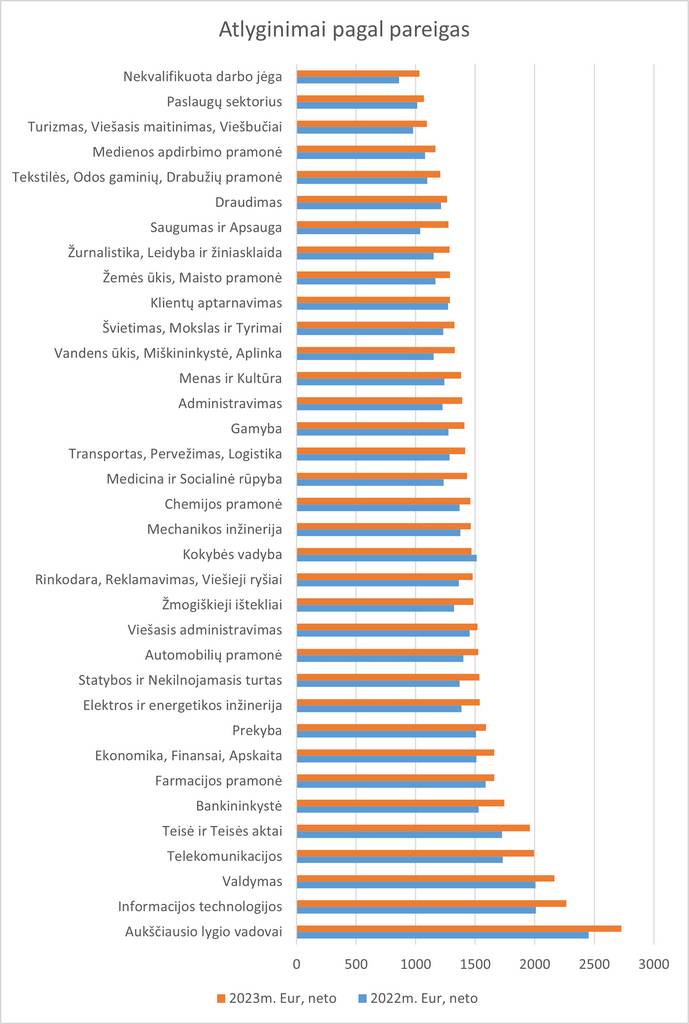 Tuo tarpu daugiau nei 10 procentų atlyginimai 2023 metais augo apsaugos darbuotojams, nekvalifikuotai darbo jėgai, medicinos, socialinė rūpybos, telekomunikacijų, vandens ūkio, miškininkystės, bankininkystės, teisės, administravimo, IT, žmogiškųjų išteklių, statybų, žurnalistikos, svetingumo sektoriaus, kultūros, energetikos inžinerijos srities darbuotojams bei aukščiausio lygio vadovams.