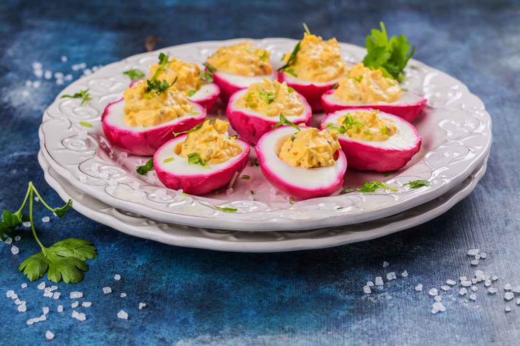 Kiaušinių baltymą ir netgi šiek tiek trynį galima lengvai nudažyti pasitelkus natūralias priemones: ryškiaspalves daržoves, prieskonius ir actą.