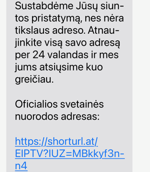 35 metų moteris laukė siuntos iš LP Express. Į mobiliojo ryšio telefoną atskriejusi žinutė LP Express vardu informavo, kad ant siuntos nurodytas neteisingas pristatymo adresas.