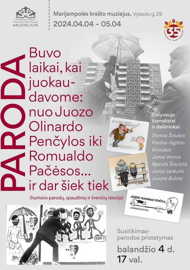 Balandžio 4 d., ketvirtadienį, 17 val. Marijampolės krašto muziejuje (Vytauto g. 29) parodos „Buvo laikai, kai juokaudavome: nuo Juozo Olinardo Penčylos iki Romualdo Pačėsos… ir dar šiek tiek“ pristatymas ir susitikimas su dailininkais, žurnalistais.