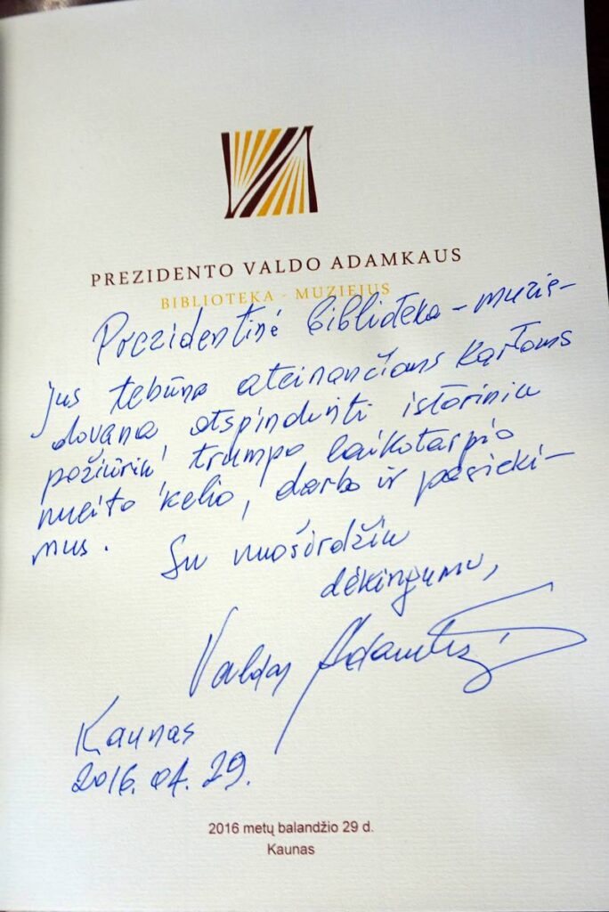 – Per visus tuos metus tapome labai artimi su prezidentu. Kai jo jau neteksime, aišku, ir muziejaus-bibliotekos gyvenimas keisis. Dabar prezidento namuose Turniškėse yra daug ypatingų eksponatų, yra paveikslai, knygos, kurias jis labiausiai mėgsta. V. Adamkaus valia po jo mirties visa tai atiteks mūsų bibliotekai-muziejui, tai jau aptarta. Žinoma, tam reikės nemažai vietos, bet mes turime rimtus steigėjus – VDU ir Kauno miesto savivaldybę, kurie labai vertina ir puikiai supranta V. Adamkaus memorialo buvimo Kaune svarbą. Prezidentas Kaune gimė, augo ir susiformavo kaip asmenybė, ir marijampoliečiai, kurie turi prezidentą K. Grinių, manau, tai puikiai supranta ir vertina, – sakė A. Antanaitis.