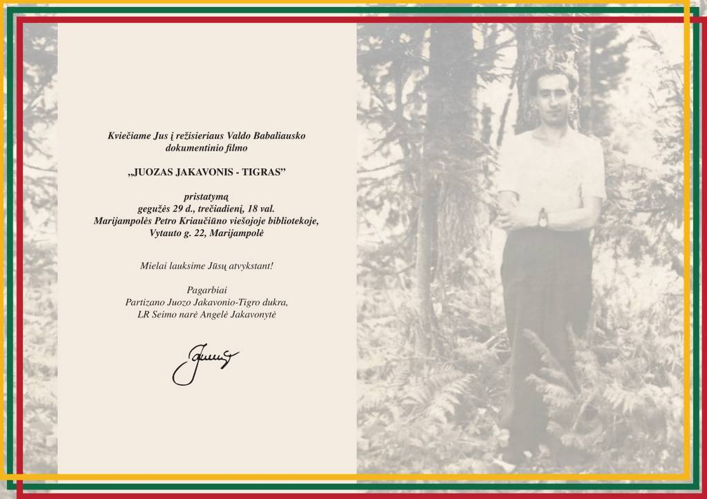 Rytoj, gegužės 29 d., 18 val. Marijampolės Petro Kriaučiūno viešojoje bibliotekoje (Vytauto g. 22, Marijampolė) vyks dokumentinio filmo „Juozas Jakavonis-Tigras“ pristatymas.