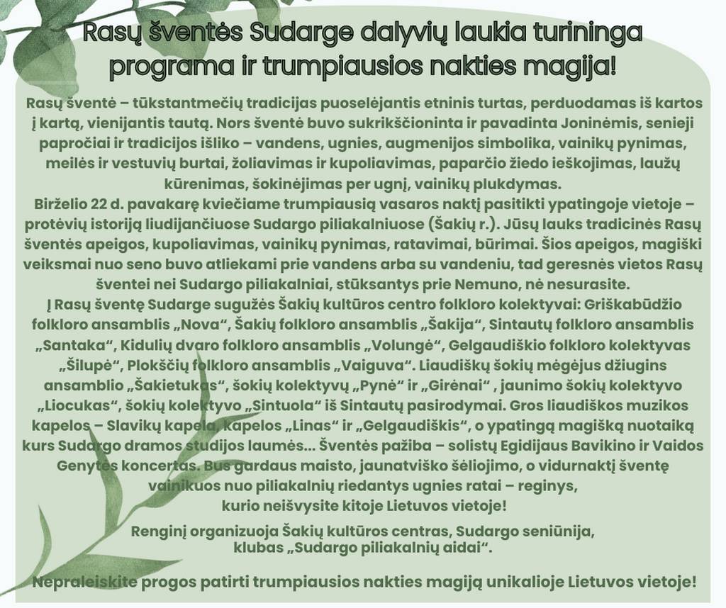 Birželio 22 d. trumpiausią vasaros naktį pasitikite ypatingoje vietoje – protėvių istoriją liudijančiuose Sudargo piliakalniuose (Šakių r.). Jūsų lauks tradicinės Rasų šventės apeigos, kupoliavimas, vainikų pynimas, ratavimai, būrimai. Šios apeigos, magiški veiksmai nuo seno buvo atliekami prie vandens arba su vandeniu, tad geresnės vietos Rasų šventei nei Sudargo piliakalniai, stūksantys prie Nemuno, nė nesurasite.