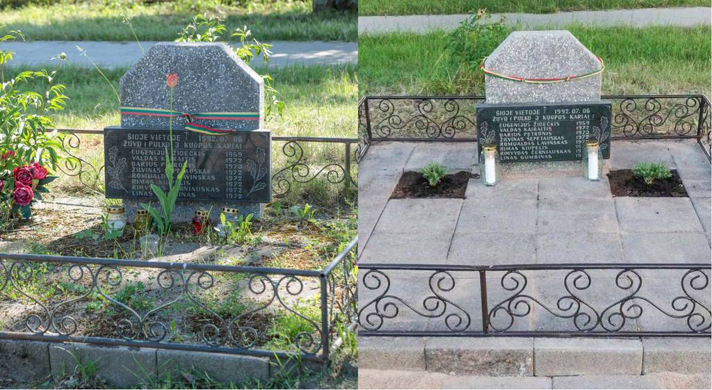 Nepraėjo nė savaitė, ir ši atmintina vieta sutvarkyta! Nuimtos plytelės, papildomai supilti 5 maišai sijoto žvyro, nuo plytelių nuvalytos samanos, atstatyti šoniniai borteliai, nuplautas paminklas ir perrištas nauja trispalve Lietuvos vėliavos juostele. Perdažyta ir tvorelė, pasodinti du krūmeliai, nuo tiltelio nuvalytos apnašos. Uždegtos žvakutės.