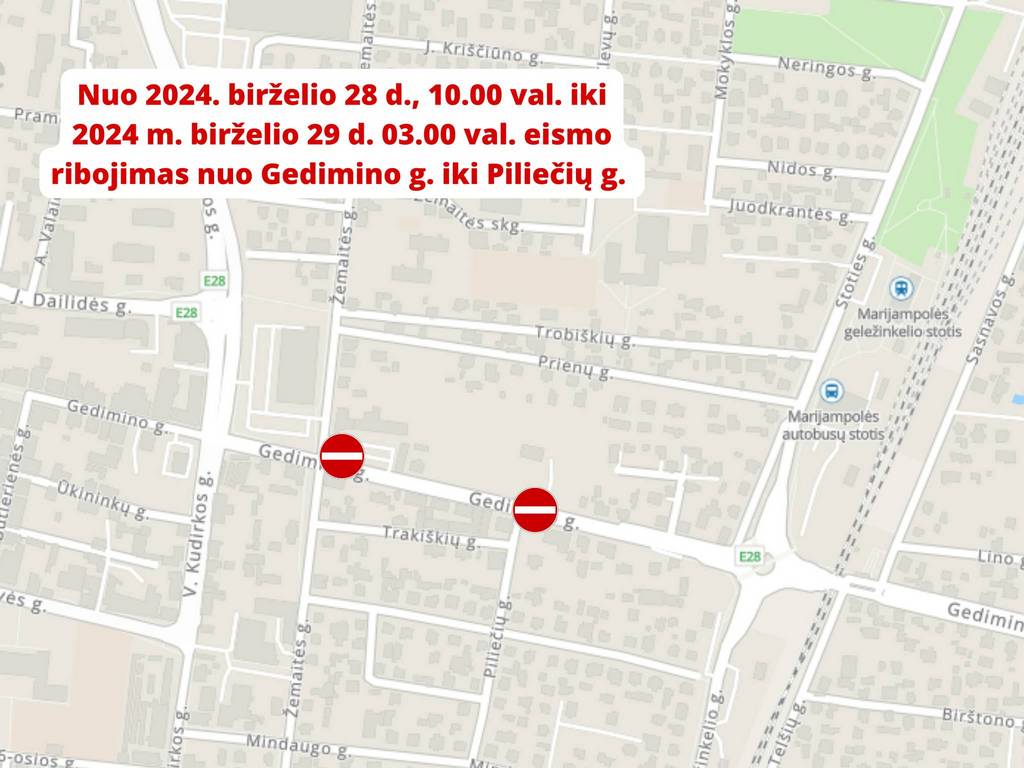 Marijampolės savivaldybės administracija praneša apie laikinus eismo ribojimus Marijampolės Gedimino–Piliečių gatvių atkarpoje.
