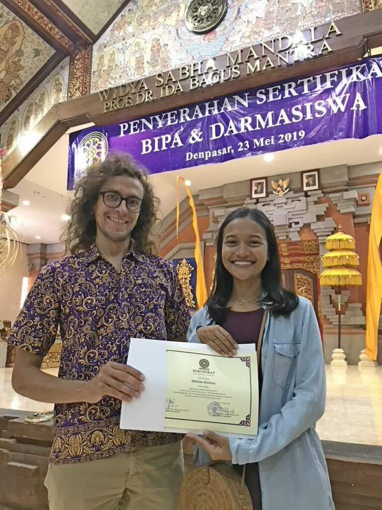 – Pamaniau – gal tai ženklas? Tikriausiai šioje šalyje yra kažkas tokio, gal čia kokia slapta energija, kokie energetiniai centrai turi būti? Nors pats nelabai jais tikiu. Matyt, kažkas už mane atsakė į šį klausimą. Nuo 2017-ųjų lapkričio iki 2019-ųjų gegužės mano gyvenimas kardinaliai pasikeitė: štai stoviu nuotraukoje su savo drauge indoneziete Misha ir indoneziečių kalbos studijų sertifikatu rankose.