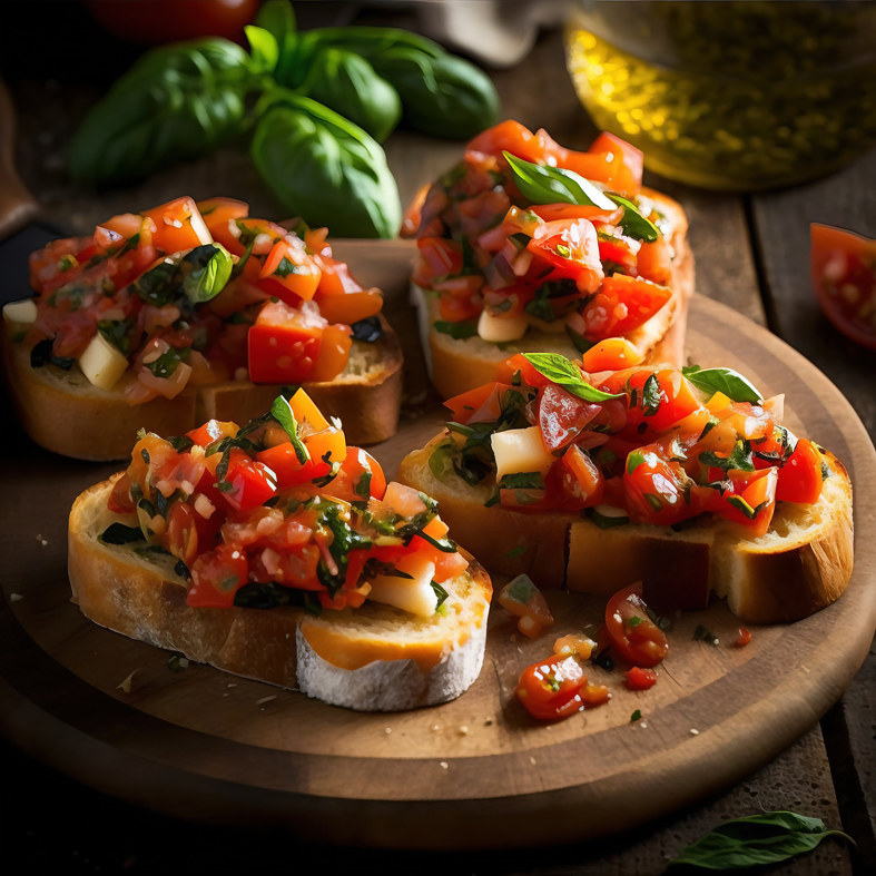 Smulkiais kubeliais supjaustome pomidorus. Įspaudžiame skiltelę česnako, sudedame smulkintą baziliką ir pabarstome druska. Batoną apšlakstome austrišku moliūgų sėklų aliejumi „Jorus“, o ant viršaus tepame paruoštą pomidorų masę. Puošiame baziliko lapeliu.