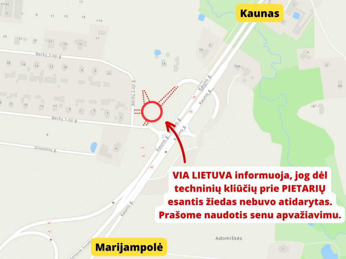 AB „Via Lietuva“ informuoja, kad eismas per naujai suformuotą žiedą ties Pietarių kaimu nebuvo atidarytas nuo rugsėjo 2 d., kaip buvo planuota anksčiau, dėl laiku neatliktų darbų. Iki rugsėjo 16 d. įvažiavimas ir išvažiavimas iš teritorijos prie Pietarių k. vyks pagal senąją eismo organizavimo schemą (įvažiuojant į Pietarius laikytis kairės pusės, išvažiuojant dešinės).