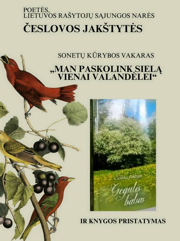 Rugsėjo 12 d. 17 val. šiuo posmu poetė, Lietuvos rašytojų sąjungos narė Česlova Jakštytė, kviečia į sonetų vakarą „Man paskolink sielą vienai valandėlei“. Jis vyks Petro Kriaučiūno viešojoje bibliotekoje. Bus skaitomi sonetai iš naujausios, šiais metais autorės išleistos, knygos „Gegulės balsas“ bei ankstesnių rinkinių. Vakaro metu skambės klasikinė muzika.