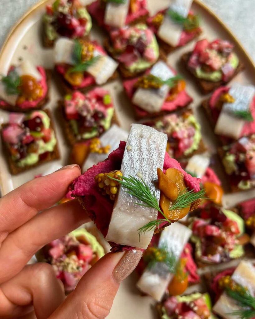 - Ant duonos skrebučių tepame burokėlių humusą, dedame silkės, šiek tiek grūdėtųjų garstyčių, kelmučių ir šviežių krapų.