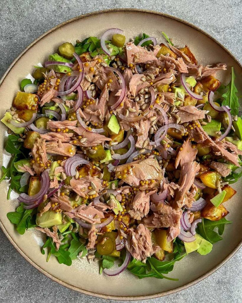 - I dubenį dedame iškepusias bulvytes, tuną, kubeliais pjaustytą avokadą, griežinėliais pjaustytus agurkėlius, smulkintą svogūną, saulėgrąžas.