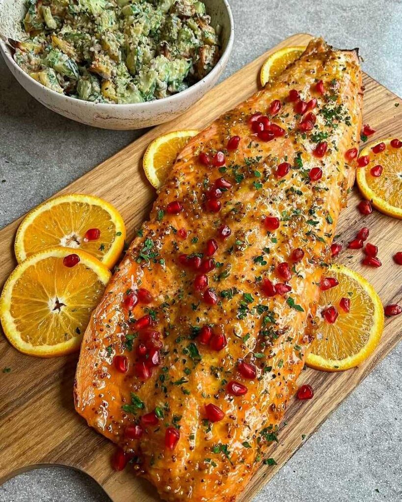 Reikės: 1 didesnio lašišos filė (apie 800 g–1 kg), druskos, pipirų, 2 v. š. alyvuogių aliejaus, 2 skiltelių česnako, 1 apelsino žievelės, 150 ml šviežiai spaustų apelsino sulčių, 2 v. š. agavų sirupo, 1 v. š. grūdėtųjų garstyčių, 1 apelsino, granato sėklų, šviežių petražolių.