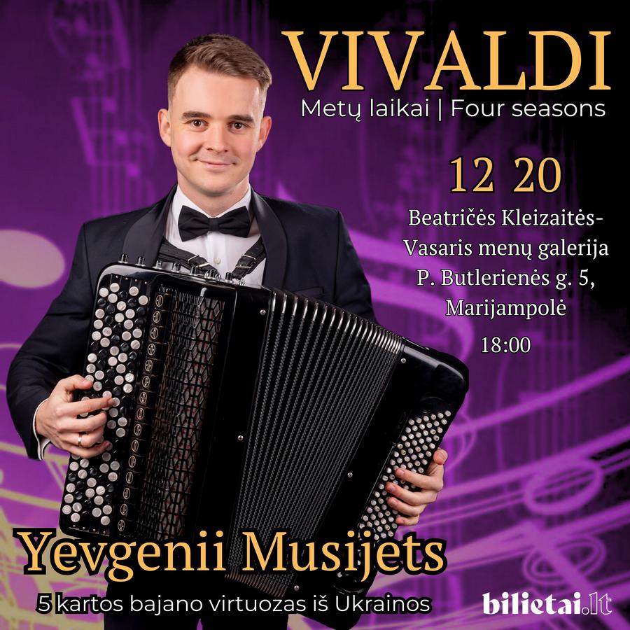 Gruodžio 20 dieną, penktadienį, 18 val. Beatričės Kleizaitės-Vasaris menų galerijoje (P. Butlerienės g. 5, Marijampolė) koncertuos penktosios kartos bajano virtuozas iš Ukrainos Jevgenijus Musijets (Yevgenii Musijets). Renginio programoje talentingasis ukrainietis atliks italų kompozitoriaus Antonijaus Vivaldžio (Antonio Vivaldi) muzikos šedevrą „Metų laikai“.
