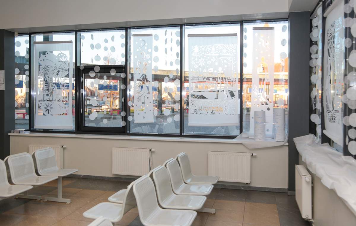 Marijampolės autobusų stoties languose karpiniai vėl seka žiemos pasaką