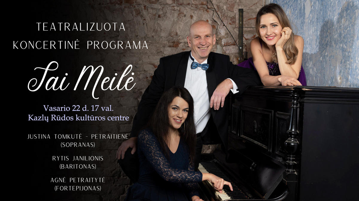 Vasario 22 d., šeštadienį, 17 val. Kazlų Rūdos savivaldybės kultūros centre vyks populiarios klasikos koncertas „Tai meilė“. Koncerte skambės kūriniai iš linksmiausių ir gražiausių operečių bei miuziklų. Jų vingrios siužeto linijos, pagardintos turtingomis emocijomis bei geros energijos užtaisu, leis muzika mėgautis visą koncertą.