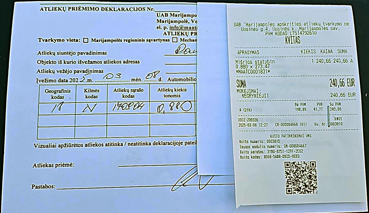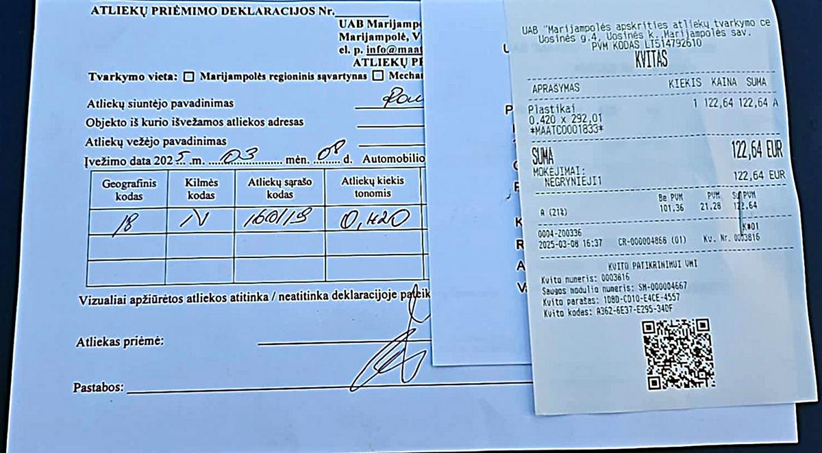 Kitą savaitgalį – kovo 8-ąją, prieš pietus, marijampolietis su draugu prisikrovė sunkvežimiuką – beveik toną – mišrių atliekų ir vėl nuvažiavo į Uosinės sąvartyną. Čia ir vėl jas pasvėrė, paskaičiavo, kad reikia sumokėti 240,66 euro (tona 273,47 Eur), ir nurodė, kur jas išpilti.