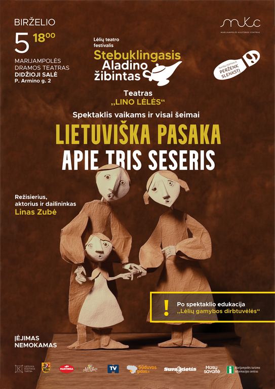 Birželio 5 d. 18 val. stebuklingasis Aladinas kviečia į Dramos teatro didžiąją salę (P. Armino 2) Klaipėdos lėlių teatro spektaklį „Lietuviška pasaka apie tris seseris“ ir po jo vyksiančią edukaciją. Tai ne tik pasaka vaikams – tai subtilus, vizualiai išgrynintas ir intelektualus teatro reiškinys, žadinantis vaizduotę ir skatinantis gilesnį žvilgsnį į liaudies kūrybą.