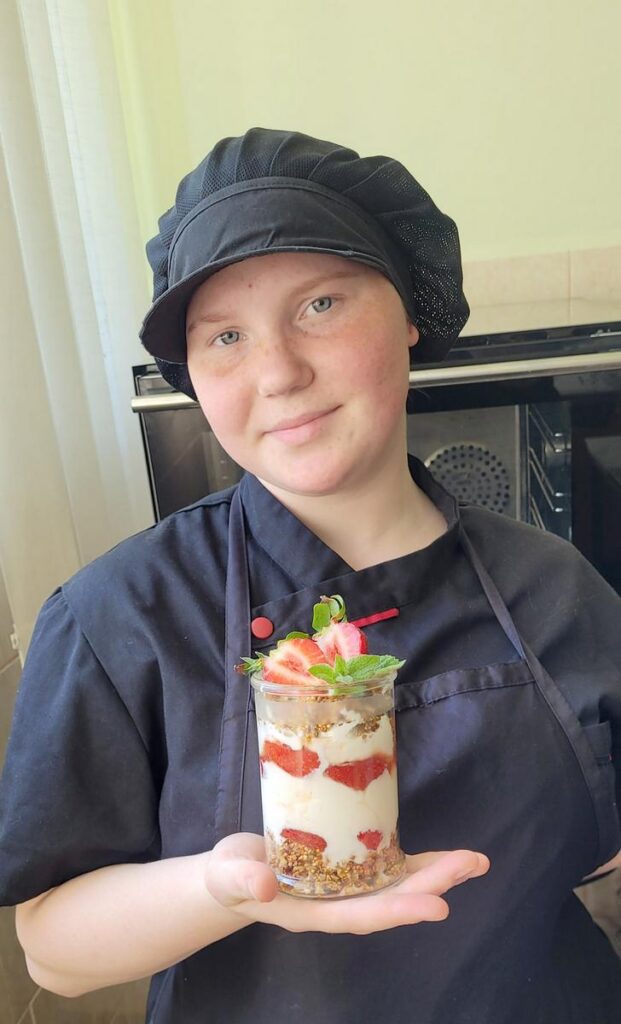 Kamilė Baltuškonytė Marijampolės profesinio rengimo centre (MTEC) mokosi virėjo profesijos. Apie bolivinių balandų desertą su braškėmis Kamilė pasakoja įkvepiančiai: ,,Viskas pavyko lengvai, o gaminimo procesas buvo tikrai malonus – smagu išbandyti ką nors naujo. Skonis – nuostabus: trašku, gaivu ir ne per saldu. Tikrai kartosiu ir rekomenduoju kitiems paragauti!“