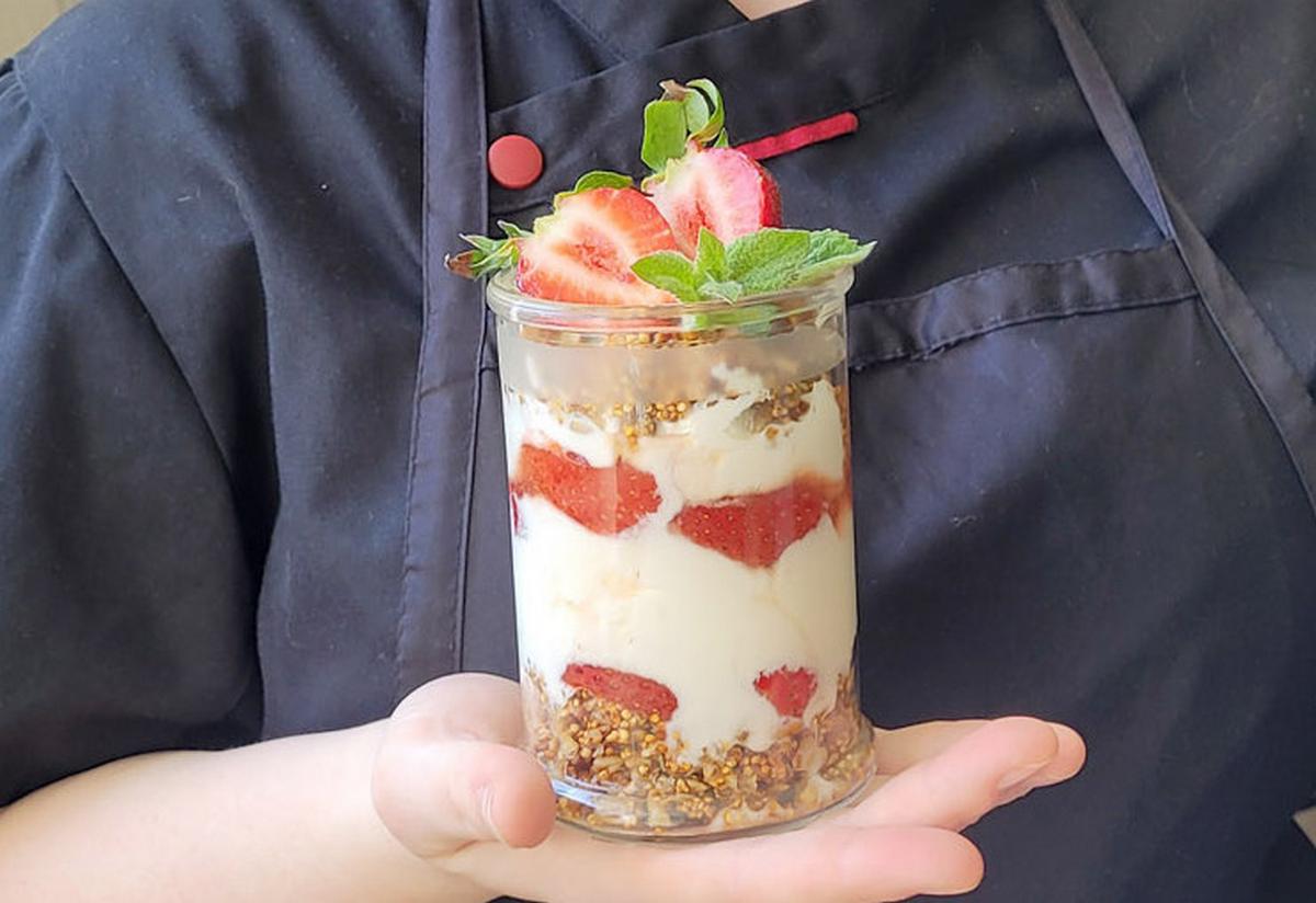 Deserto sluoksniavimas: į stiklinę ar dubenėlį dėkime dalį graikiško jogurto, tada – traškią kruopų ir saulėgrąžų masę ir karamelizuotas braškes. Kartokime sluoksnius, kol sunaudosime visus ingredientus.