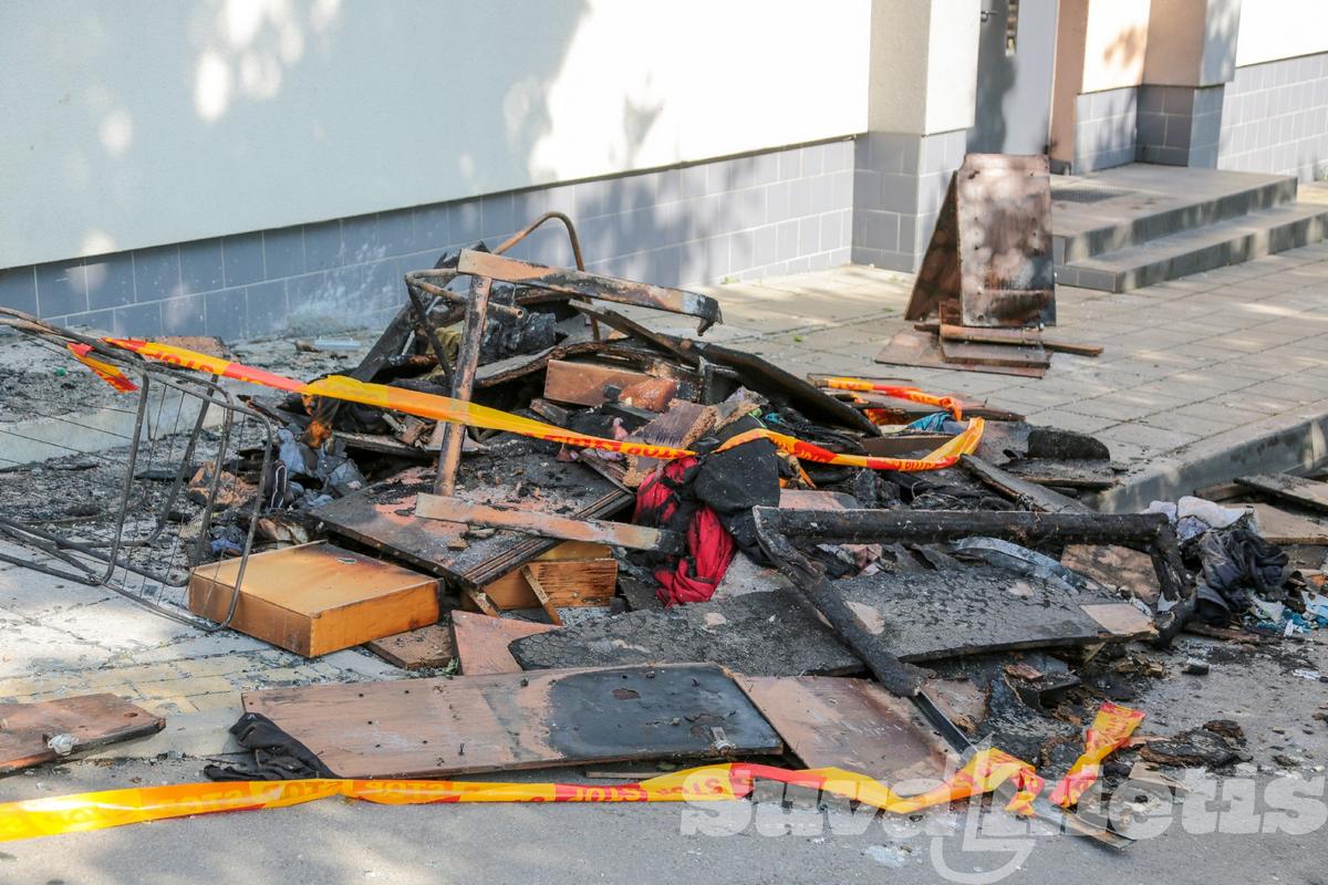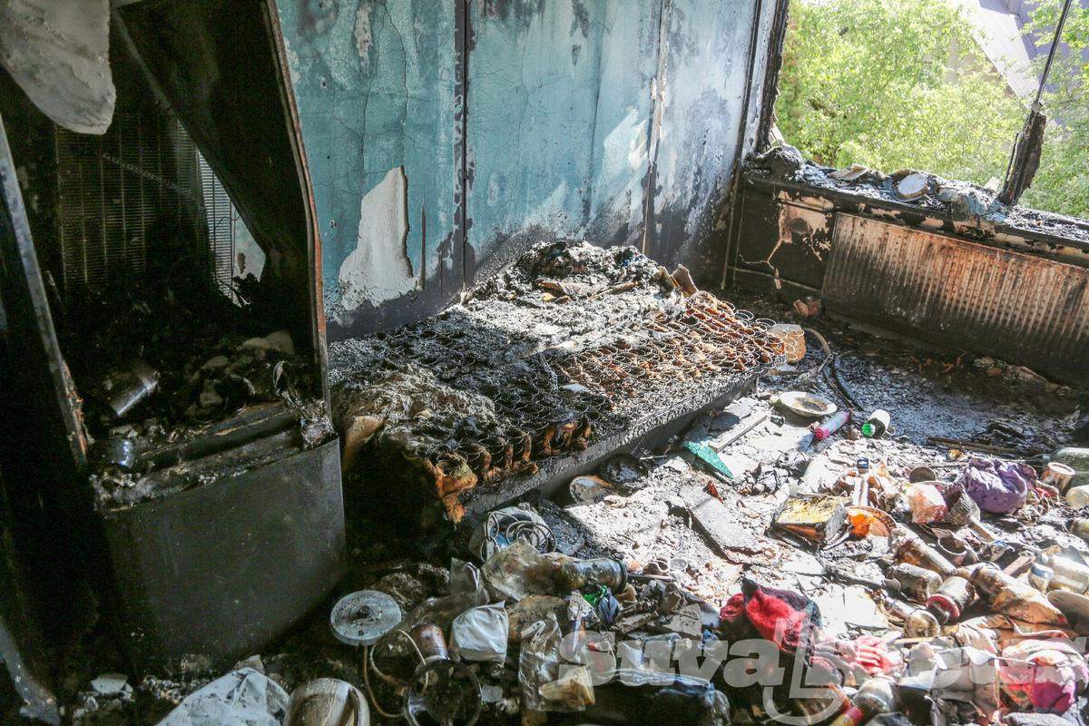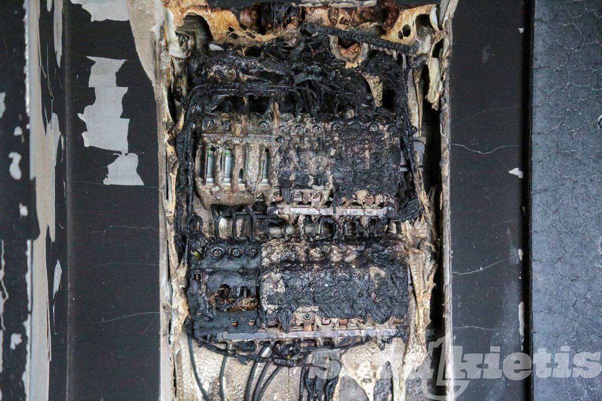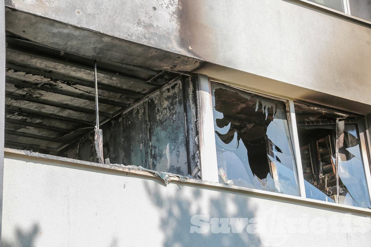 Koridoriaus sienos, lubos juodos, išsilydę šviestuvai. Nuo karščio apgadintos gretimai esančių butų durys, trečiame aukšte susproginėję langų stiklai. Pastatas apjuodęs net iš išorės.