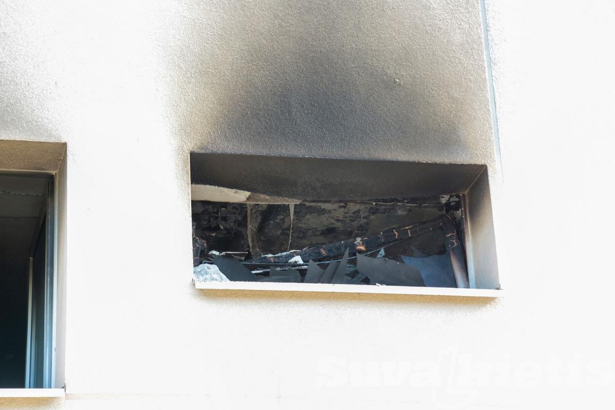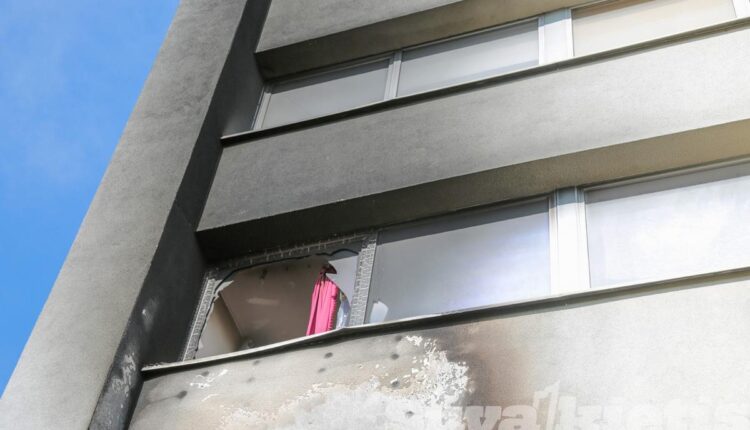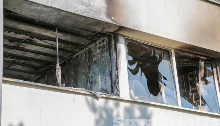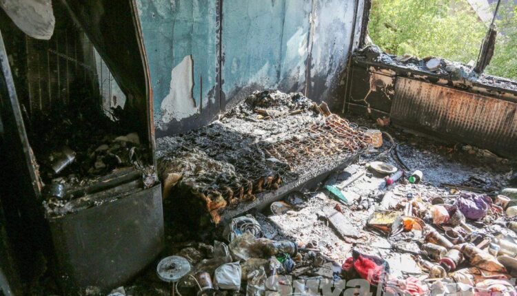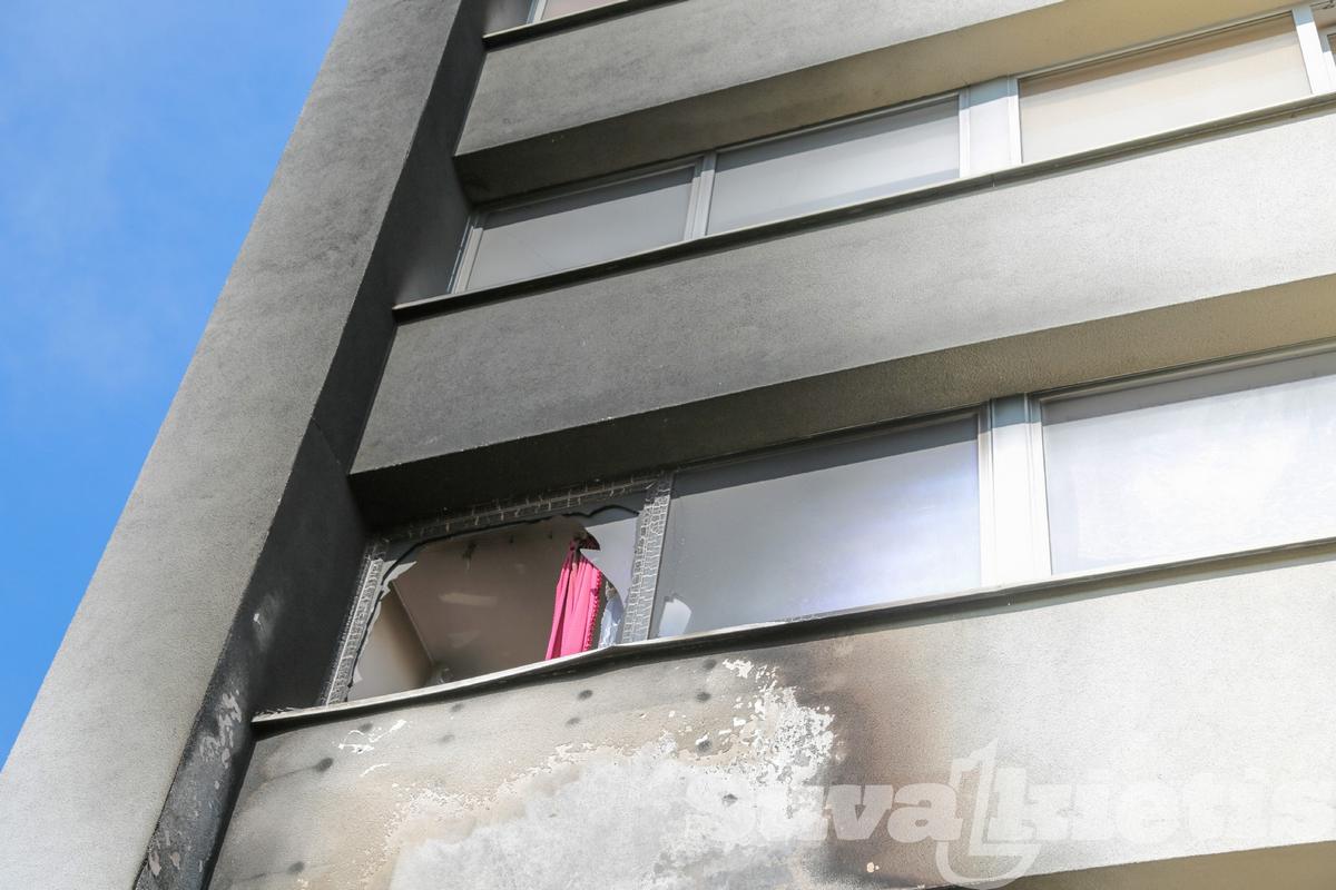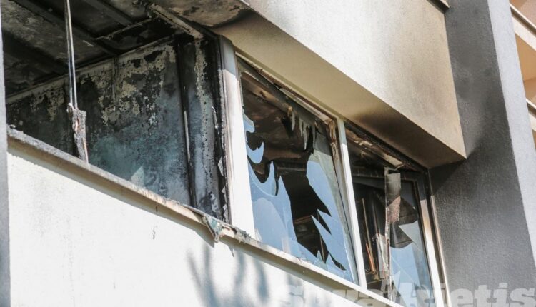 Koridoriaus sienos, lubos juodos, išsilydę šviestuvai. Nuo karščio apgadintos gretimai esančių butų durys, trečiame aukšte susproginėję langų stiklai. Pastatas apjuodęs net iš išorės.
