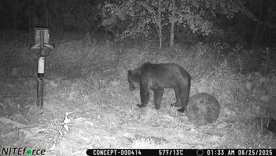 Šiandien gavome pranešimą, kad mešką šiąnakt užfiksavo Buktos miške įrengta vaizdo stebėjimo kamera. Kaip „Suvalkiečiui“ sakė Juozas Pučinskas (jis – medžiotojų klubo „Dovinė“ narys, 25-erius metus vadovavęs minėtam klubui), naktį iš antradienio į trečiadienį nuo 00.12 iki 4.00 val. rudoji „filmavosi“ prie gyvūnų šėryklos. Pasinaudodama savo nemenka jėga, net nuvertė šėryklos vamzdį.