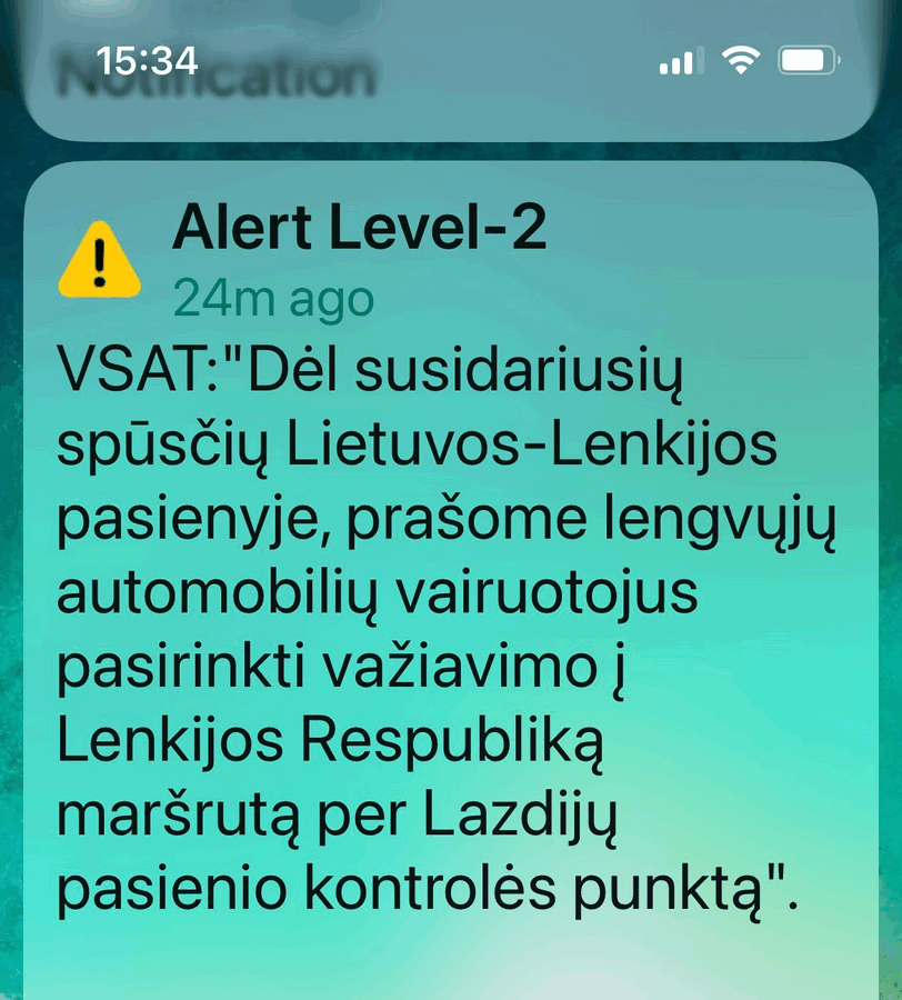 Neseniai gyventojai į savo mobiliuosius įrenginius gavo pranešimus, kad penktadienį Lietuvos–Lenkijos pasienyje susidarė spūstys. Dėl to lengvųjų automobilių vairuotojų prašoma pasirinkti važiavimo į Lenkijos Respubliką maršrutą per Lazdijų pasienio kontrolės punktą.