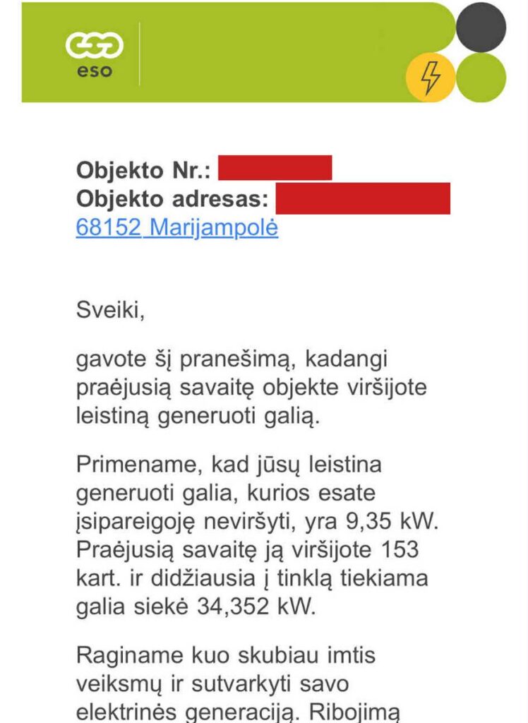 Dalis ESO gaminančių vartotojų per klaidą gavo pranešimus apie viršytą galią
