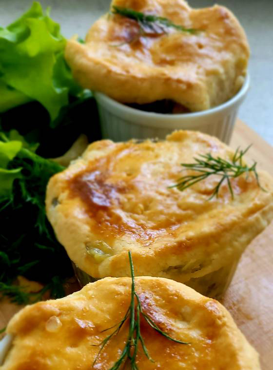 Kepame: orkaitę įkaitiname iki 200 °C. Tešlą iškočiojame ir išpjauname apskritimus, šiek tiek didesnius nei naudojamų kepimo formelių viršus. Troškinį supilstome į karščiui atsparius indelius (iki ¾ tūrio), jų viršų uždengiame tešlos lakštais. Kraštus švelniai prispaudžiame, tešloje padarome skylutes, paviršių patepame kiaušinio tryniu.