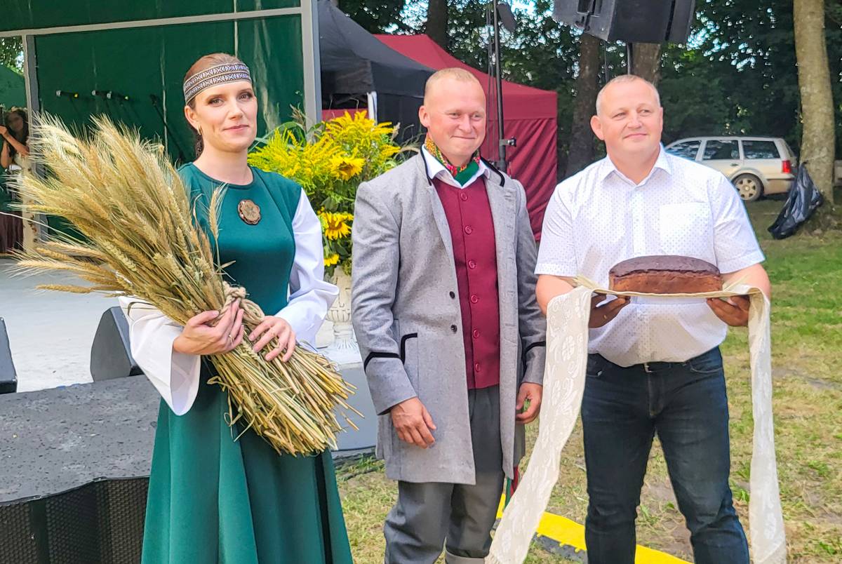 Seniūnui įteiktas didžiulis duonos kepalas iš naujojo derliaus grūdų, o duona svetingai pasidalinta su visais šventėje dalyvavusiais.