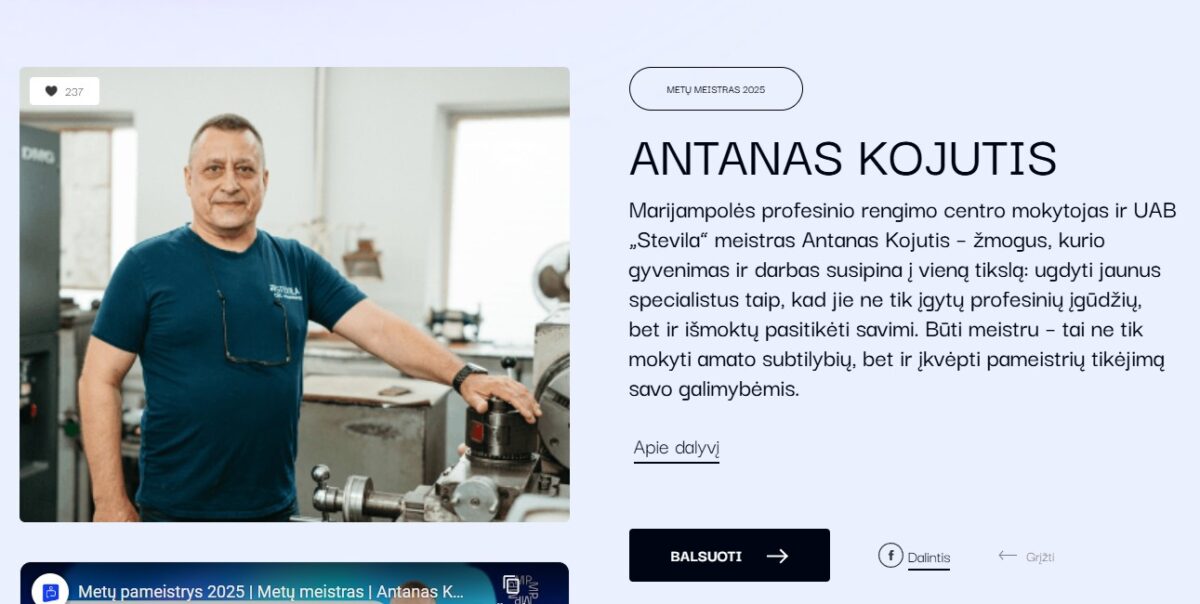 „Metų Meistro 2025“ nominacijoje dėl simpatijų prizo kaunasi mūsų krašte, ir ne tik, gerai žinomos Lietuvos ir Vokietijos UAB „Stevila“ meistras bei Marijampolės profesinio rengimo centro mokytojas Antanas Kojutis. Tad kviečiame savo balsą atiduoti būtent už šį meistrą. Balsuoti už jį galite čia: https://projektas.lrytas.lt/metu-pameistrys-2025/dalyvis/18.