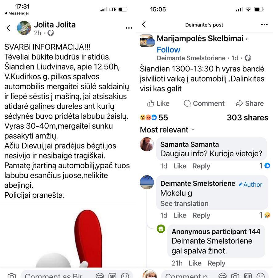 Daugelis iš mūsų socialiniame tinkle skaitėme nerimą keliančias žinutes. „Liudvinave V. Kudirkos gatvėje, 12.50 val., pilkos spalvos automobilio vairuotojas keliu einančiai mergaitei siūlė saldainių, liepė sėsti į jo automobilį. Šiai nesutikus, atidarė mašinos galines dureles, ant sėdynės buvo pridėta „Labubu“ žaislų. Vyras – 30–40 metų. Mergaitei pradėjus bėgti, jos nesivijo“.