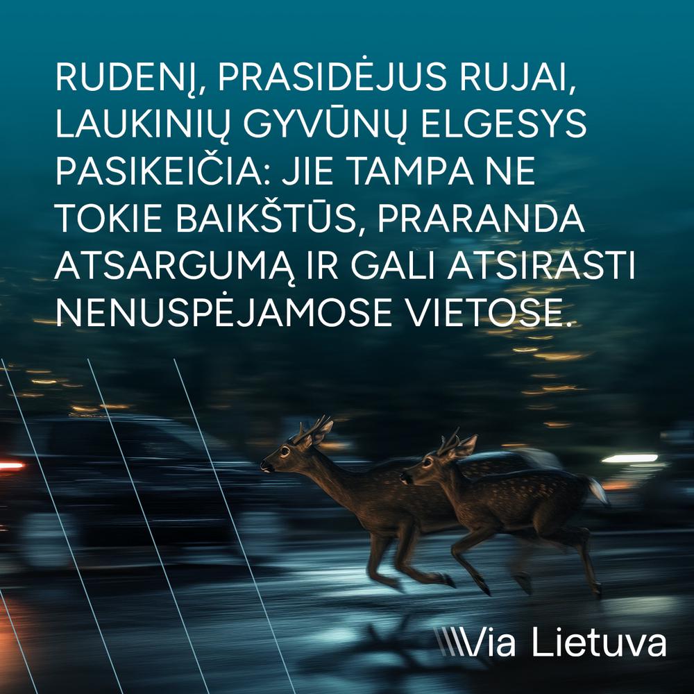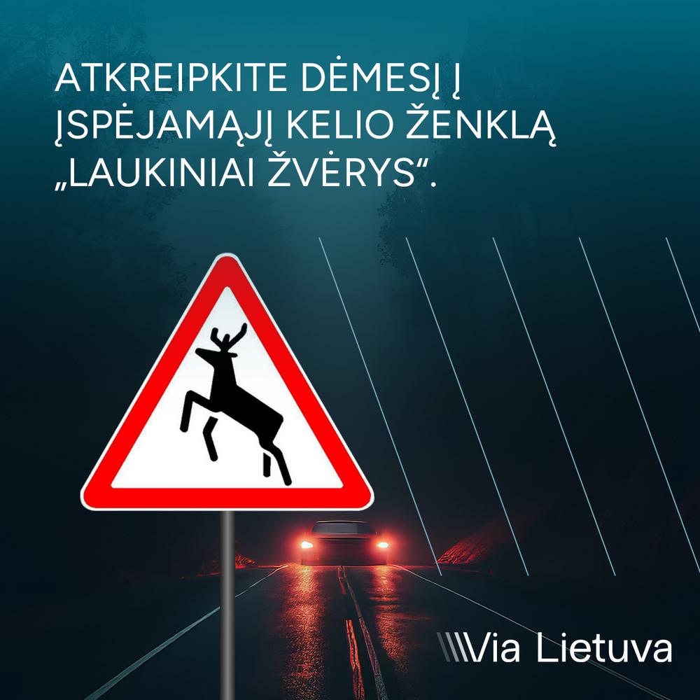 Kiekvieną rudenį suaktyvėjus gyvūnų migracijai, susidūrimai su laukiniais gyvūnais – vienas dažniausių pavojų vairuojant, ypač užmiesčio aplinkoje. „Via Lietuva“ pataria vairuotojams būti atidiems keliuose, ypač gamtinėse teritorijose. Patariama labiau sutelkti dėmesį važiuojant keliu, kuris kerta ne tik mišką, bet ir pievas. Laukiniai gyvūnai kelyje gali atsirasti ištisus metus. Gyvūnai keliuose dažniausiai pasirodo prietemoje ir naktį, 17–23 valandomis, taip pat anksti ryte.