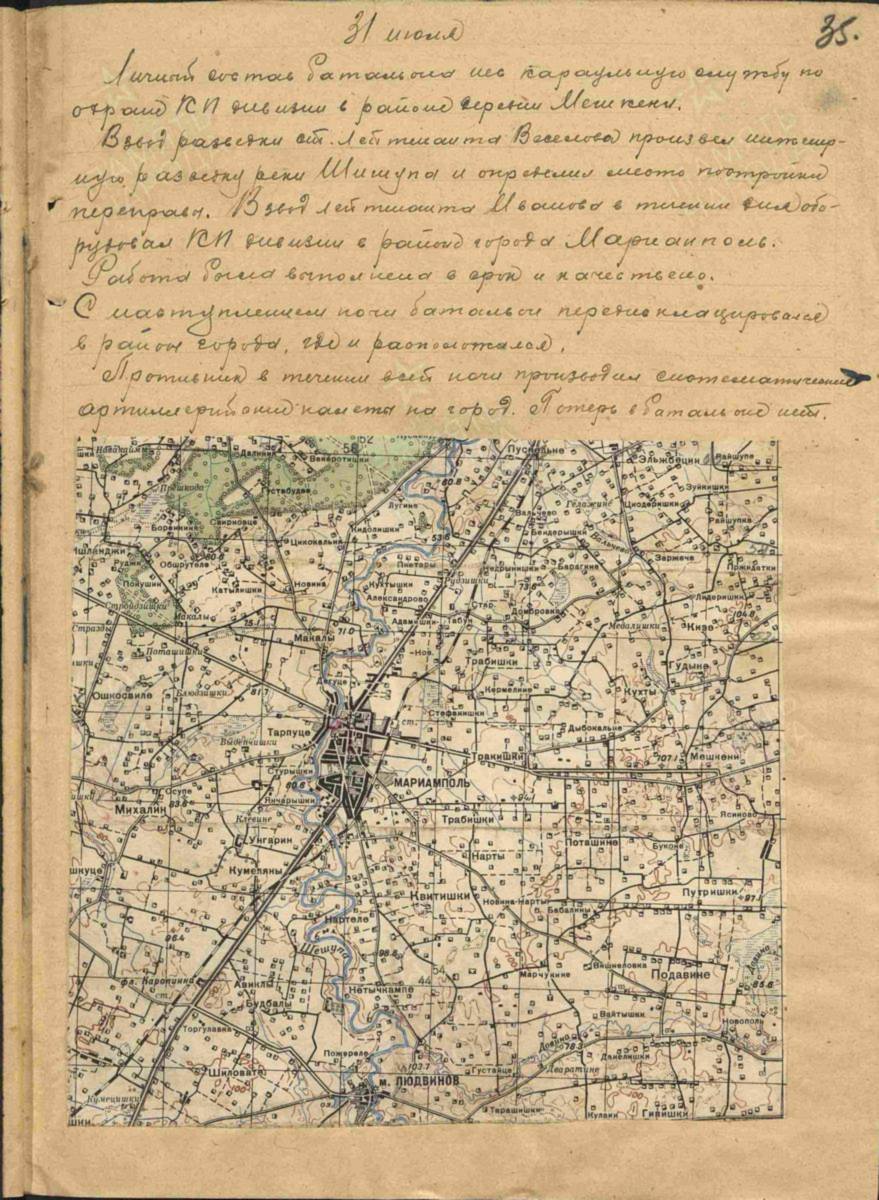 1944 m. liepos 31 d. 362 divizijos štabo raportas: 12.30 val. divizija pilnai išvalė Marijampolės miestą nuo priešų. Vokiečiai gynėsi Patašiškėse, Mikalinėje, Kumelionyse. Visą dieną šaudė kulkosvaidžiai ir minosvaidžiai. Iš minėtų vietovių pusės šaudė dvi minosvaidžių baterijos ir 10 savaeigių pabūklų. Šaudė ir bombardavo vokiečių lėktuvai „Focke-Wulf“ 190, jų skrydžių suskaičiuota 20.